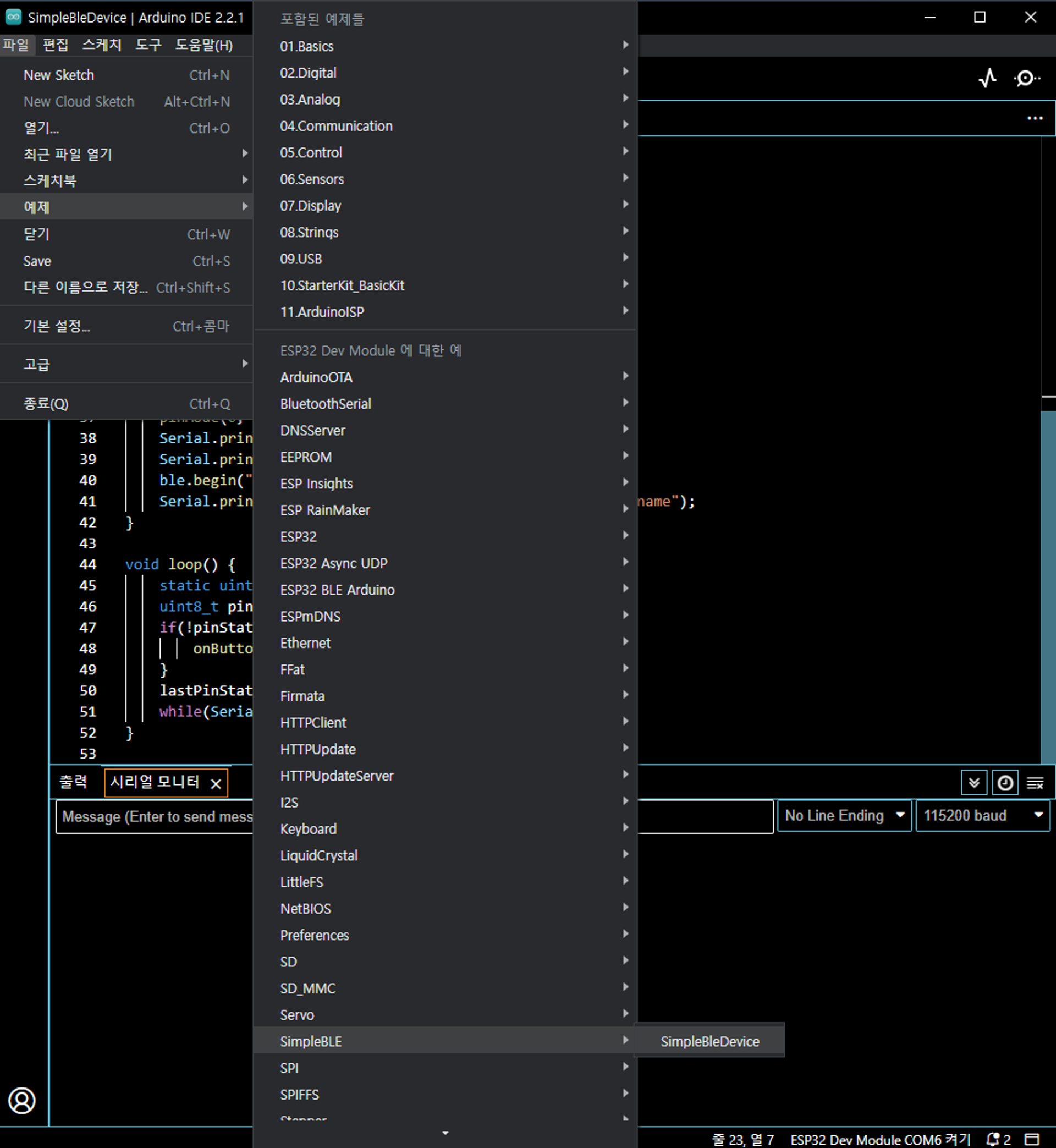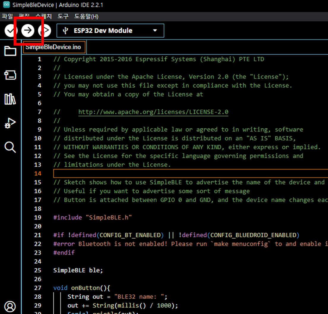 파일 → 예제 → SimpleBLE → SimpleBleDevice를 선택해 주시면 됩니다.