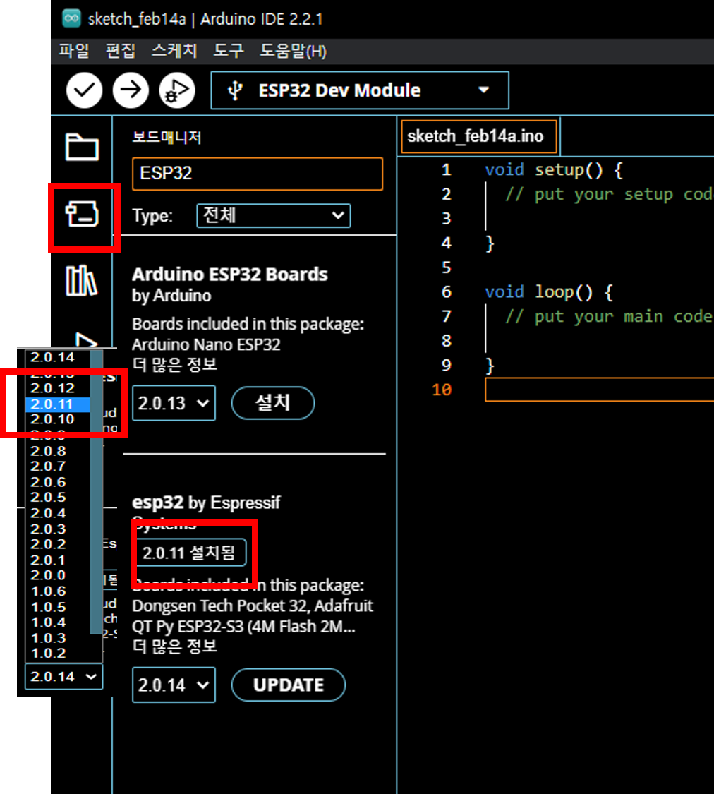 우리는 esp32 by espressif Systems를 설치해 줄 건데요, 2.0.11 버전으로 설치해 주셔야 됩니다.