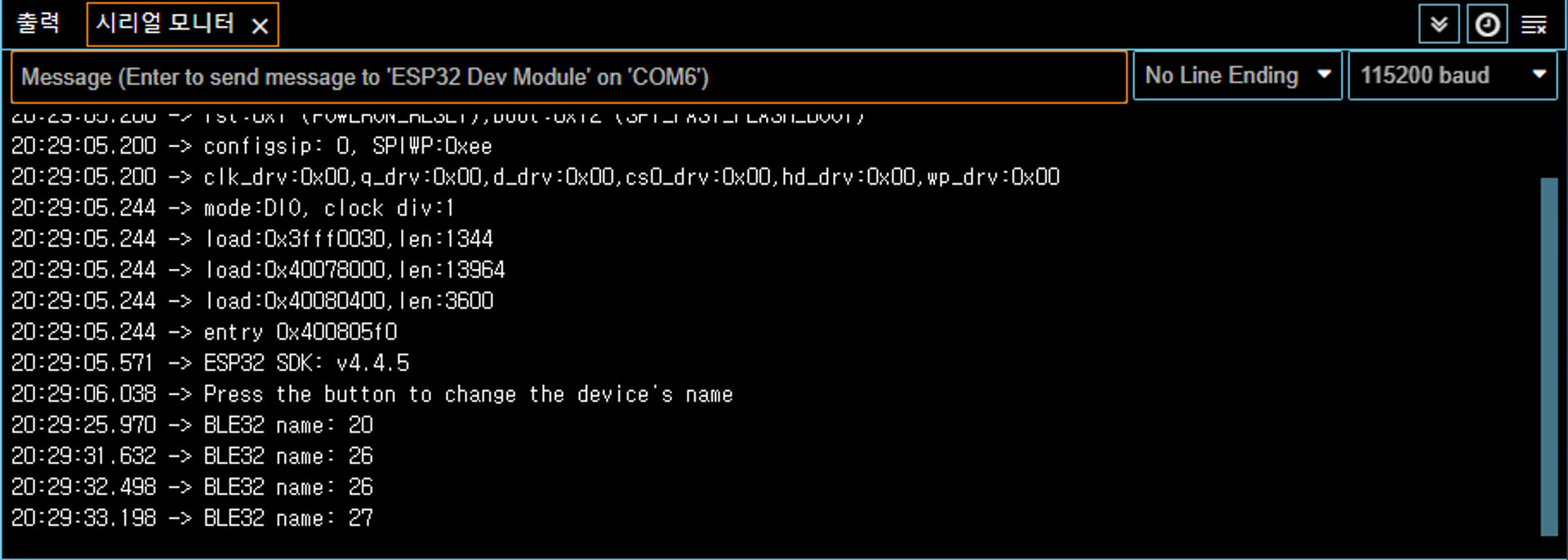 SimpleBLE 코드가 업로드된 상태에서 BOOT핀을 누르면 휴대폰으로 BLE를 검색할 때 변경된 이름으로 표시됩니다!