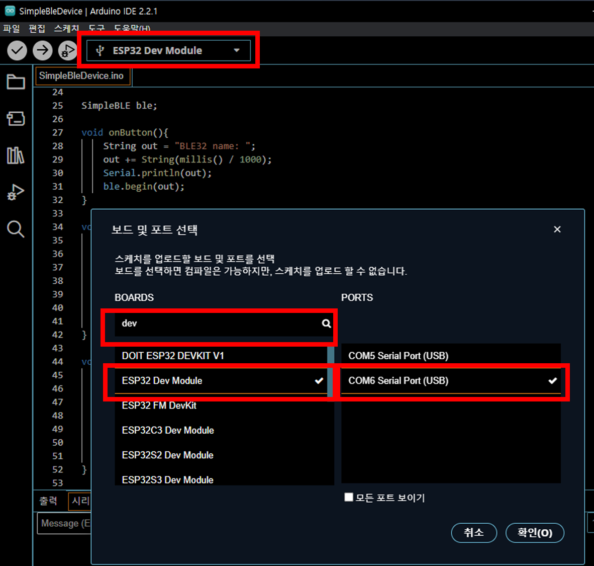 BOARDS에서 dev를 검색하여 ESP32 Dev Module을 선택합니다.