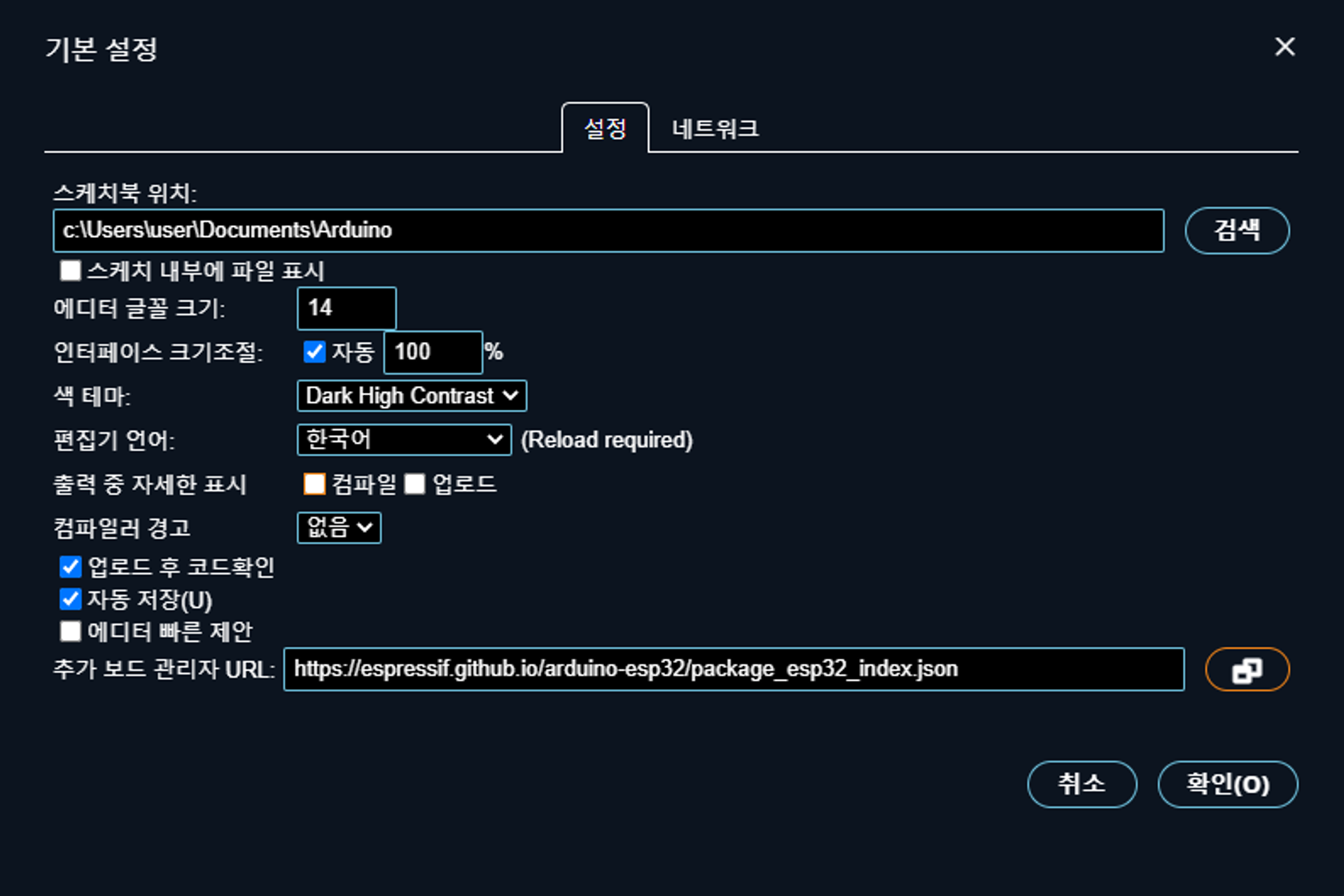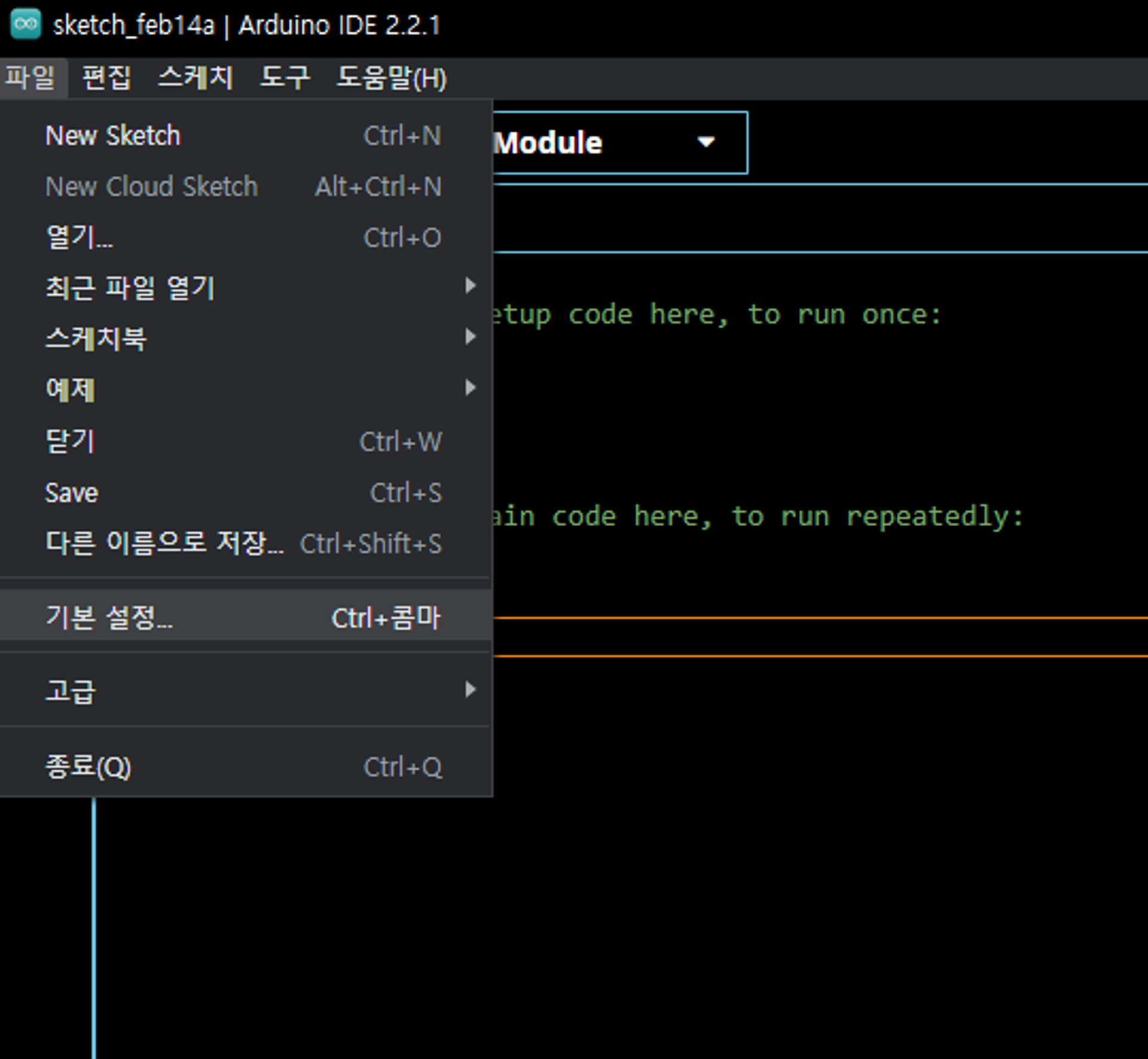 아두이노 IDE 2를 실행하시고 왼쪽 위에 파일 → 기본설정 → 설정 탭으로 들어갑니다.