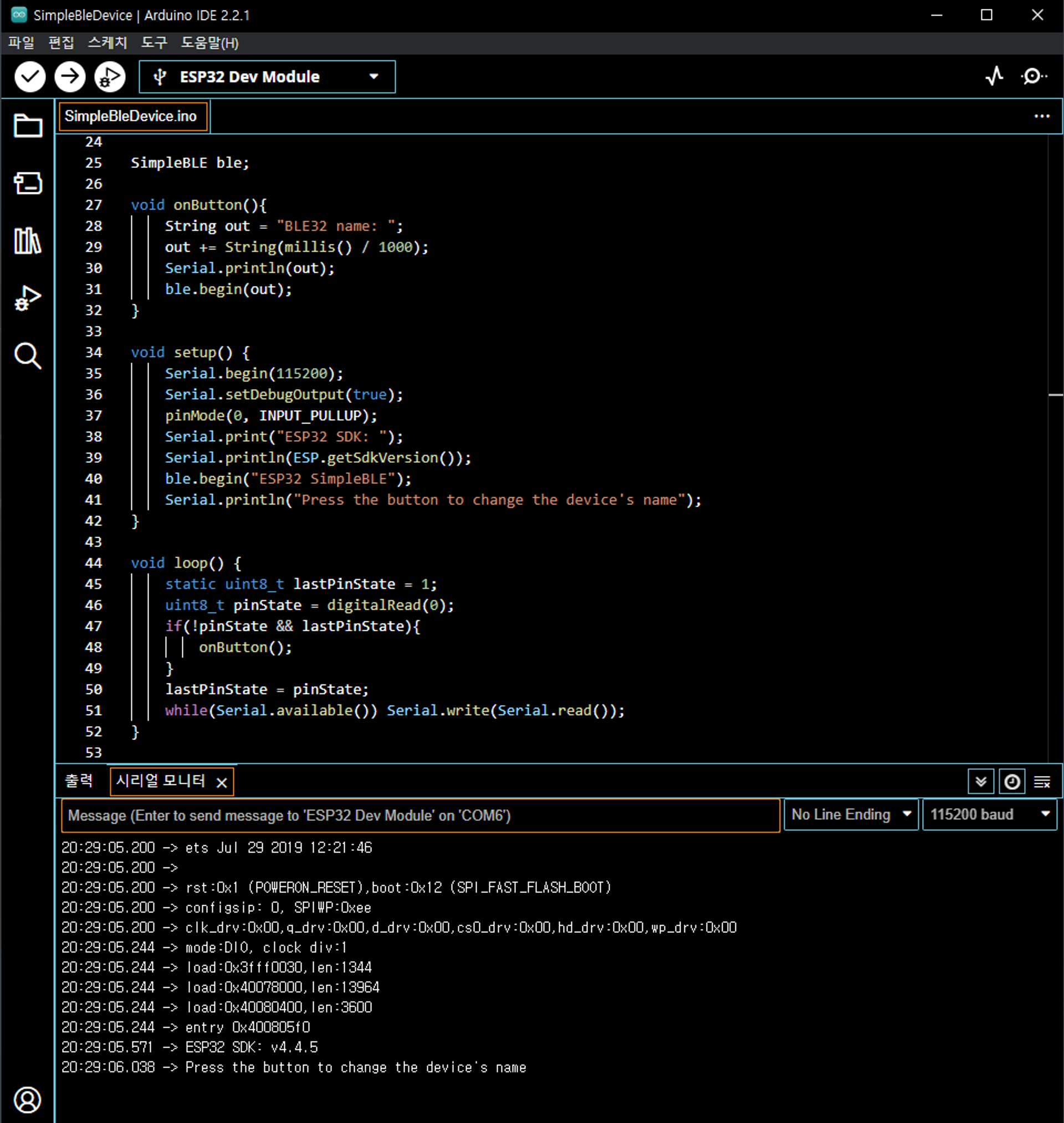 ESP32는 IoT가 장점이기 때문에 기본 예제도 simpleBLE로 테스트합니다.