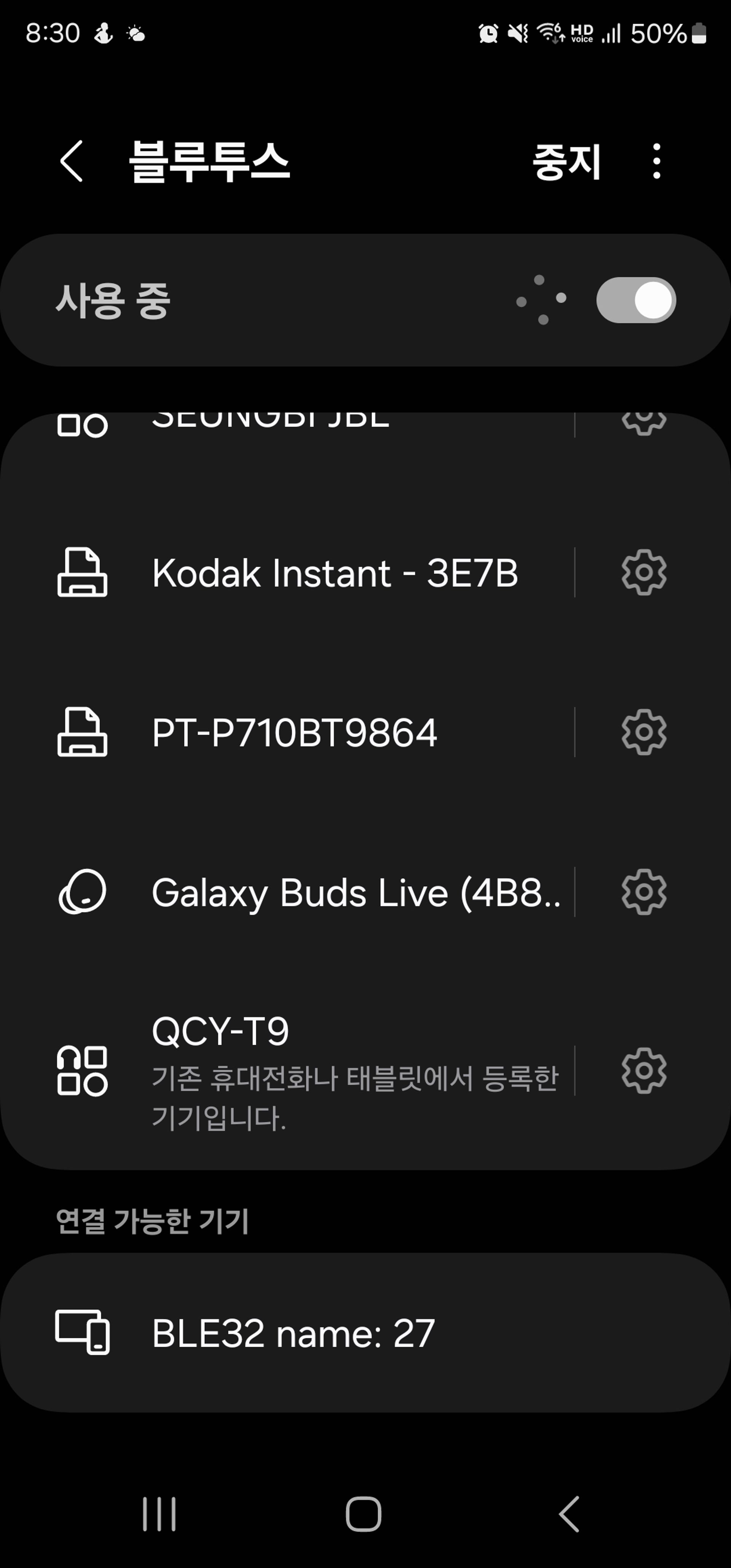휴대폰에 블루투스 기능을 켜고 연결 가능한 기기에 보시면 ESP32 SimpleBLE라고 표시가 뜹니다.