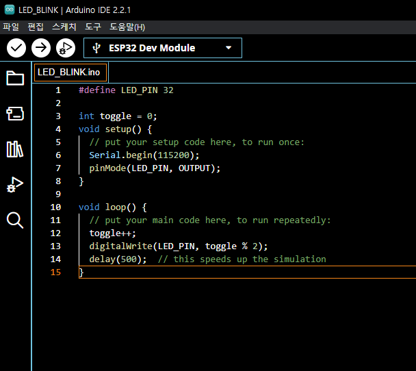 코드를 잠깐 살펴보면 digitalWrite(LED_PIN, toggle%2)에서 toggle을 2로 나눈 나머지를 LED_PIN에 입력(0,1)시켜 줍니다.