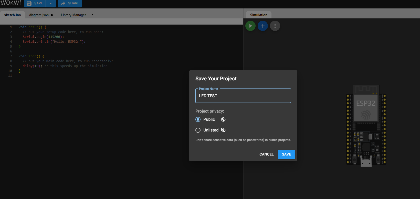 wokwi에서 프로젝트 설정하는 방법은 ESP32 → 장치설정 → ESP32 웹에서 간단히 시뮬레이션 테스트 wokwi에서 확인하실 수 있습니다. (아래 링크로도 확인 가능합니다.)