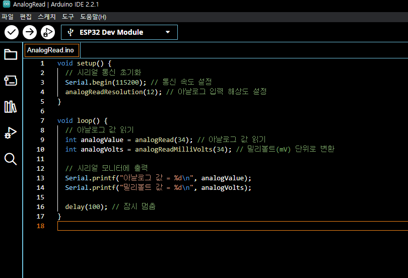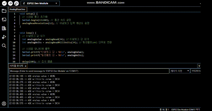 int analogValue = analogRead(34); // 핀 34에서 아날로그 값 읽기