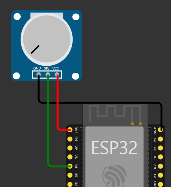 아래와 같이 VCC → 3V3, SIG → 34, GND → GND 이렇게 연결 해줍니다.