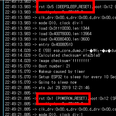 그림과 같이 Boot number가 2에서 1로 초기화되고 Wakeup was not caused by deep sleep : 0라고 표시됩니다.