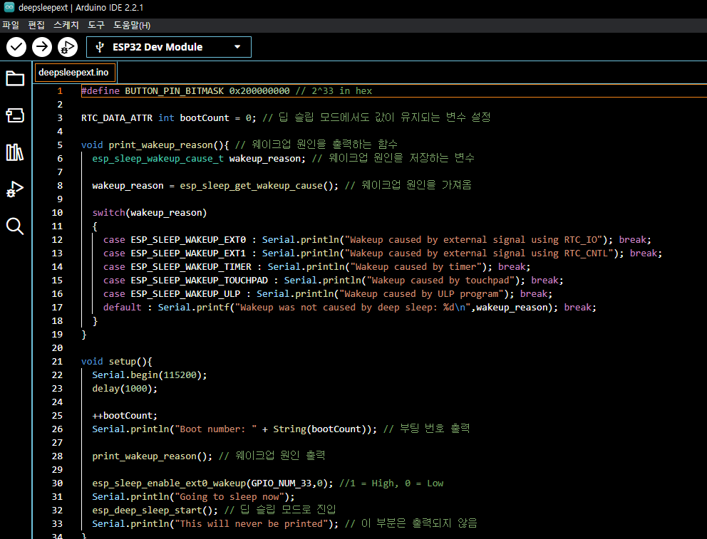 ext0 기능으로 deep sleep mode 코드 작성