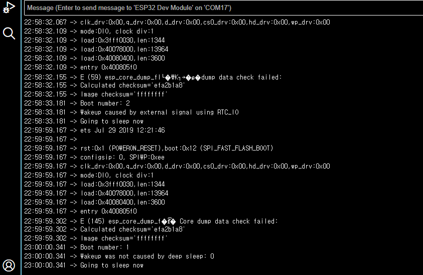 그리고 Wakeup caused by external signal using RTC_IO라고 타이머에 의해 깨어났다고 표시됩니다.