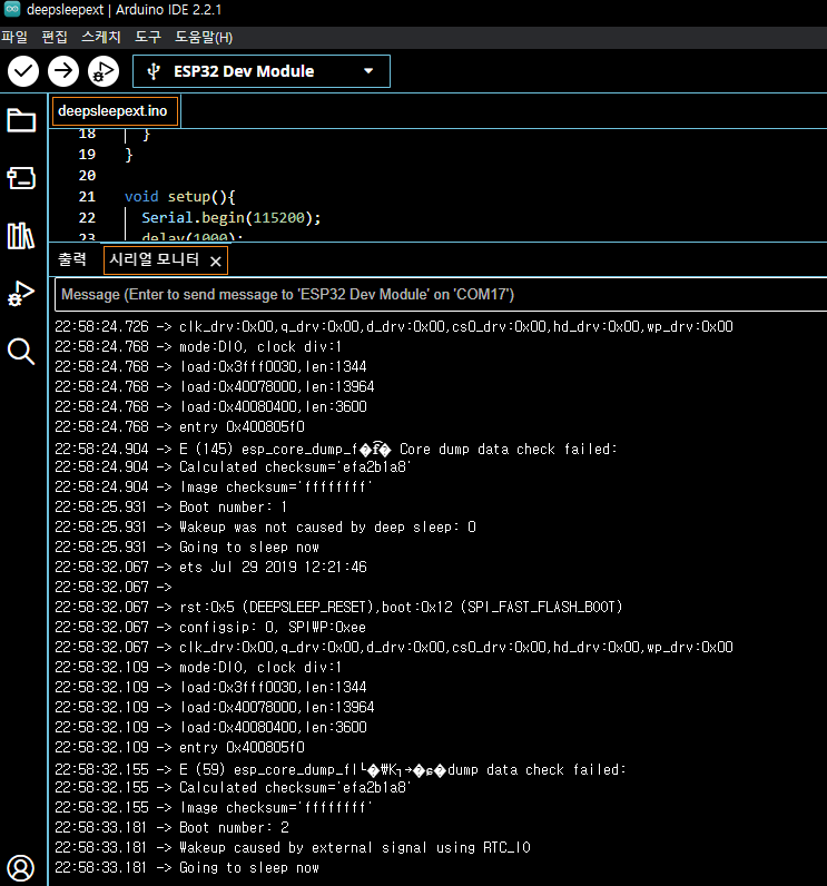 Serial.println("Boot number: " + String(bootCount)); // 부팅 번호 출력