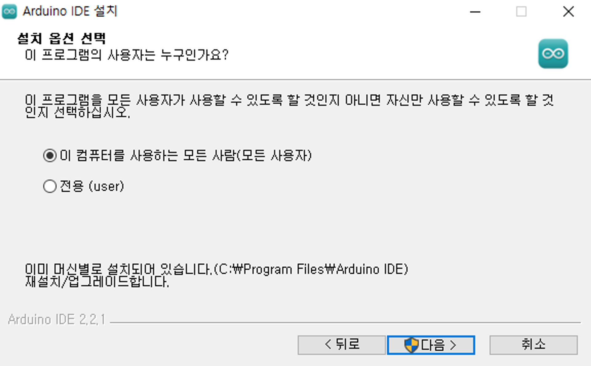 다운로드를 완료한 후 설치프로그램을 실행하여 설치를 진행할 때 옵션 선택은 반드시 '이 컴퓨터를 사용하는 모든 사람(모든 사용자)'를 선택하셔야 됩니다. 펌웨어 개발을 진행하다 보면 수만 가지의 알 수 없는 에러를 만나게 됩니다.