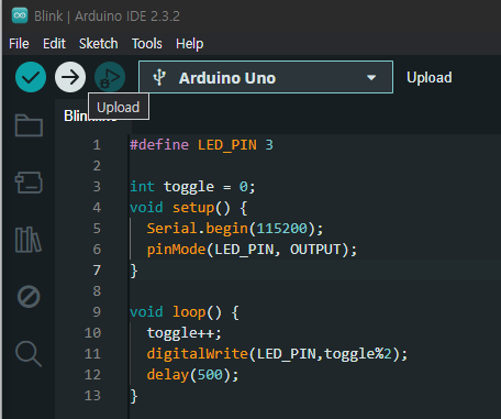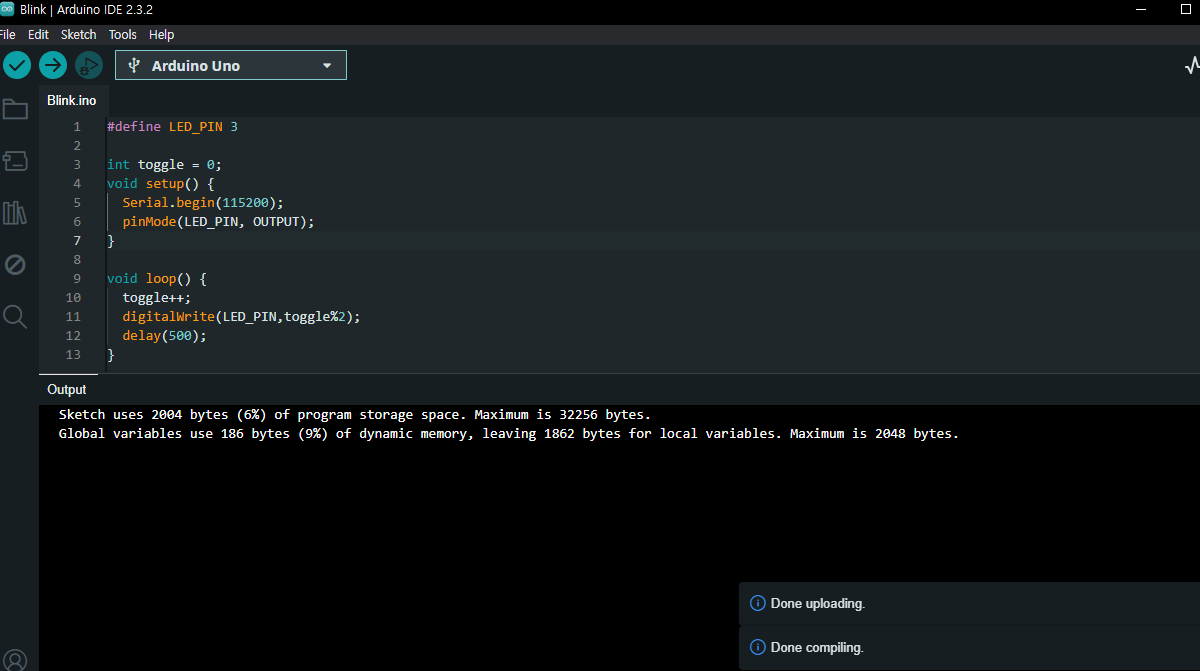 아두이노 우노를 사용하여 LED 불빛을 깜빡이는 코드를 작성해보겠습니다.