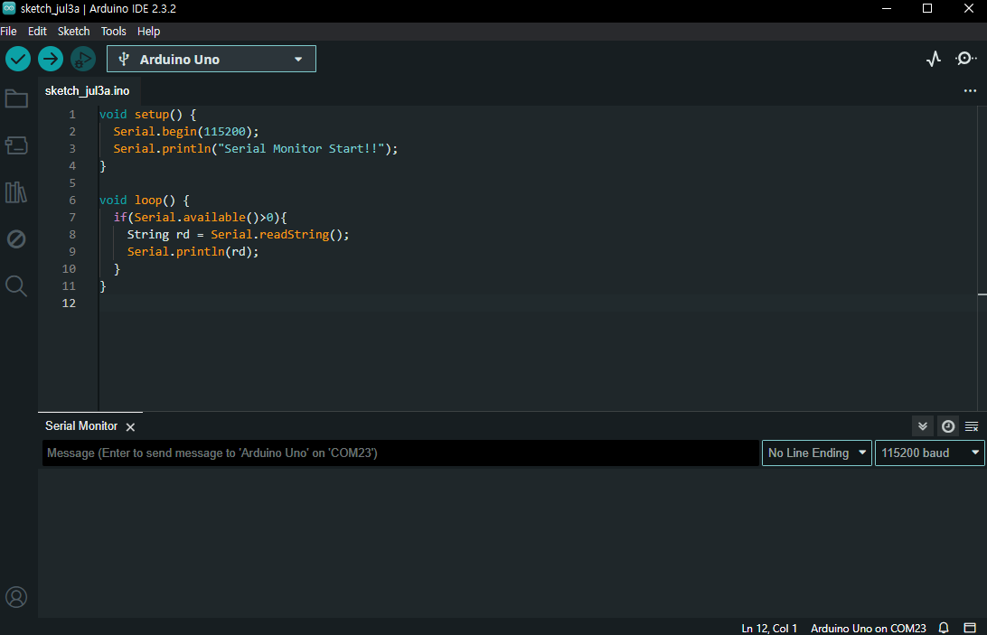 시작과 동시에 Serial Monitor Start!! 라는 메세지 창이 뜹니다.