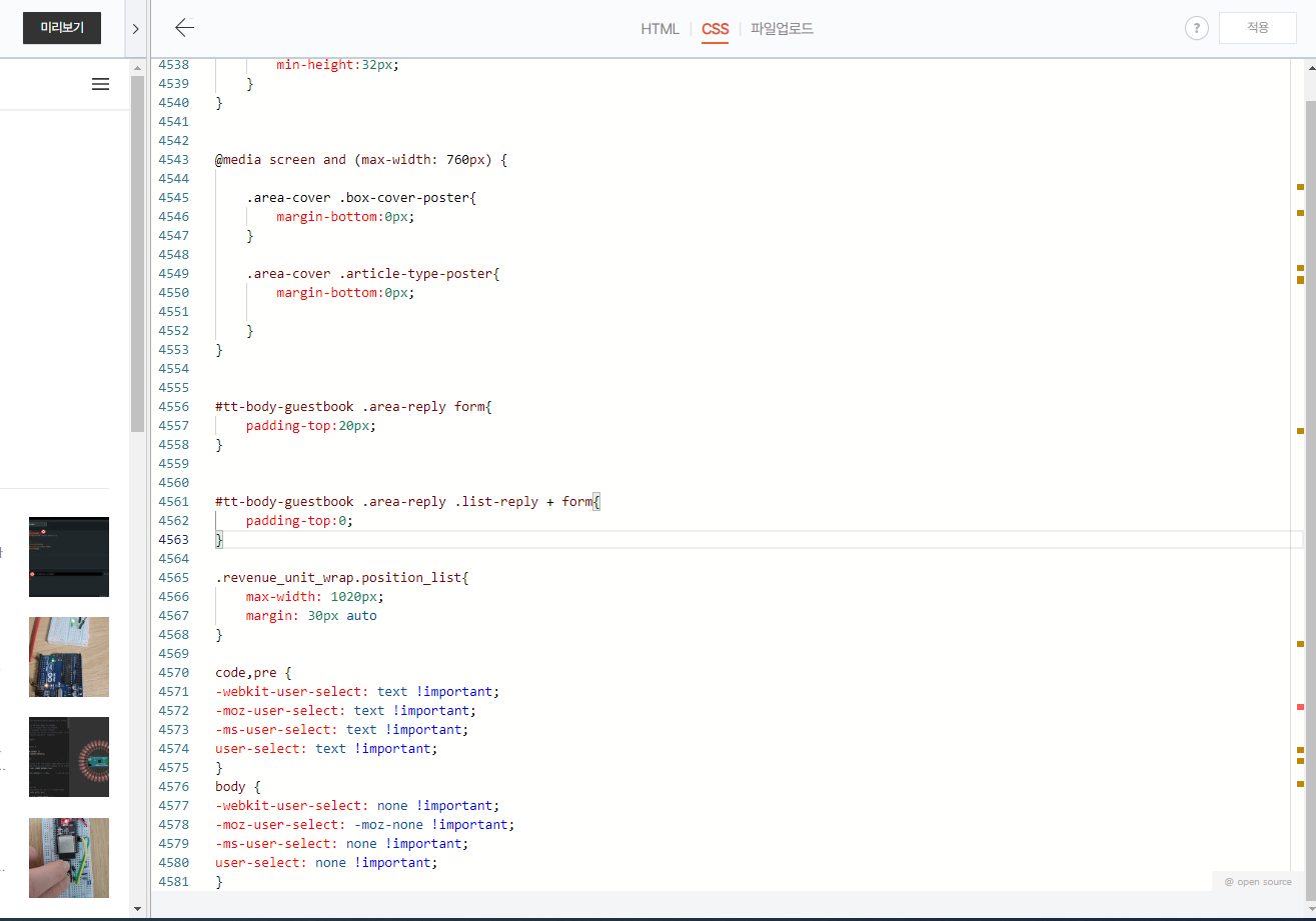 스킨편집에서 CSS 항목을 누르고 스크롤 바를 제일 아래로 내려서 코드를 추가합니다.