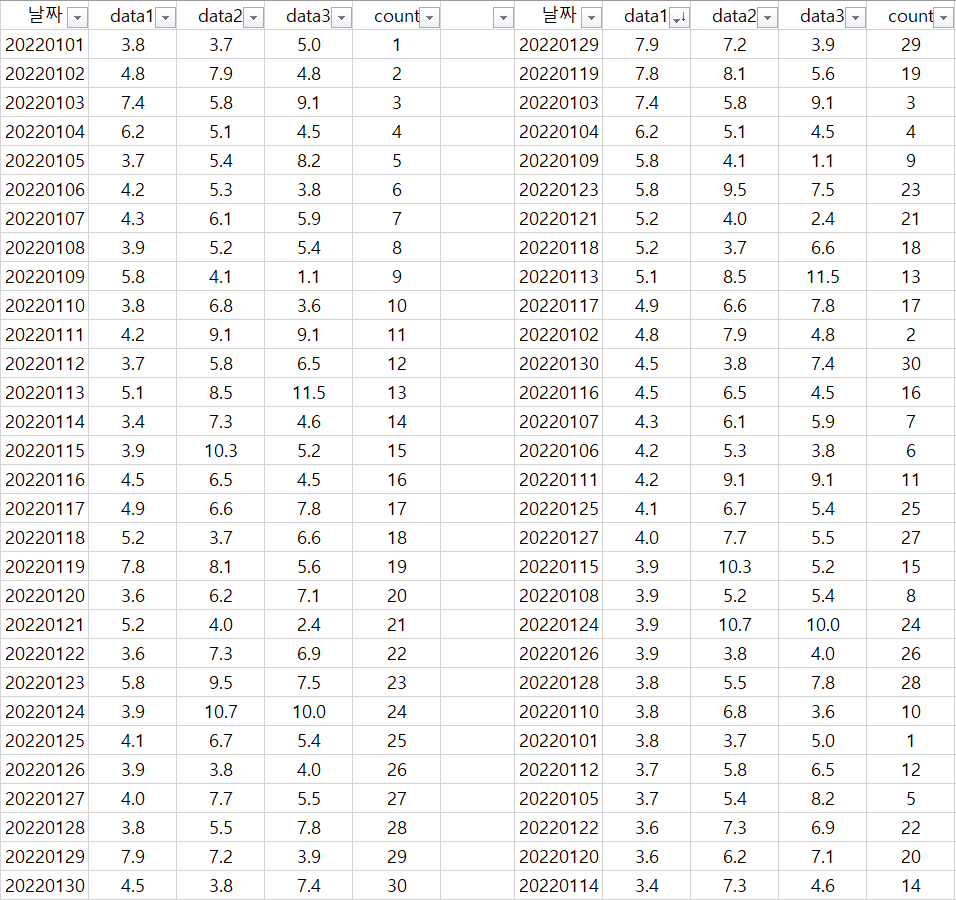 그림의 왼쪽 시간 정렬된 데이터를 오른쪽처럼 data1 최대값을 기준으로 내림차순 정렬하려 할 때
